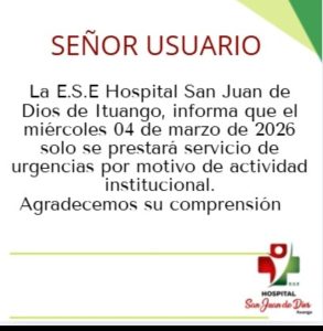 El 🗓️ miércoles 04 de marzo, el Hospital San Juan de Dios prestará únicamente servicio de urgencias, debido a la realización de una actividad institucional.